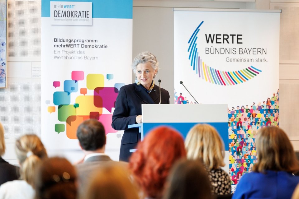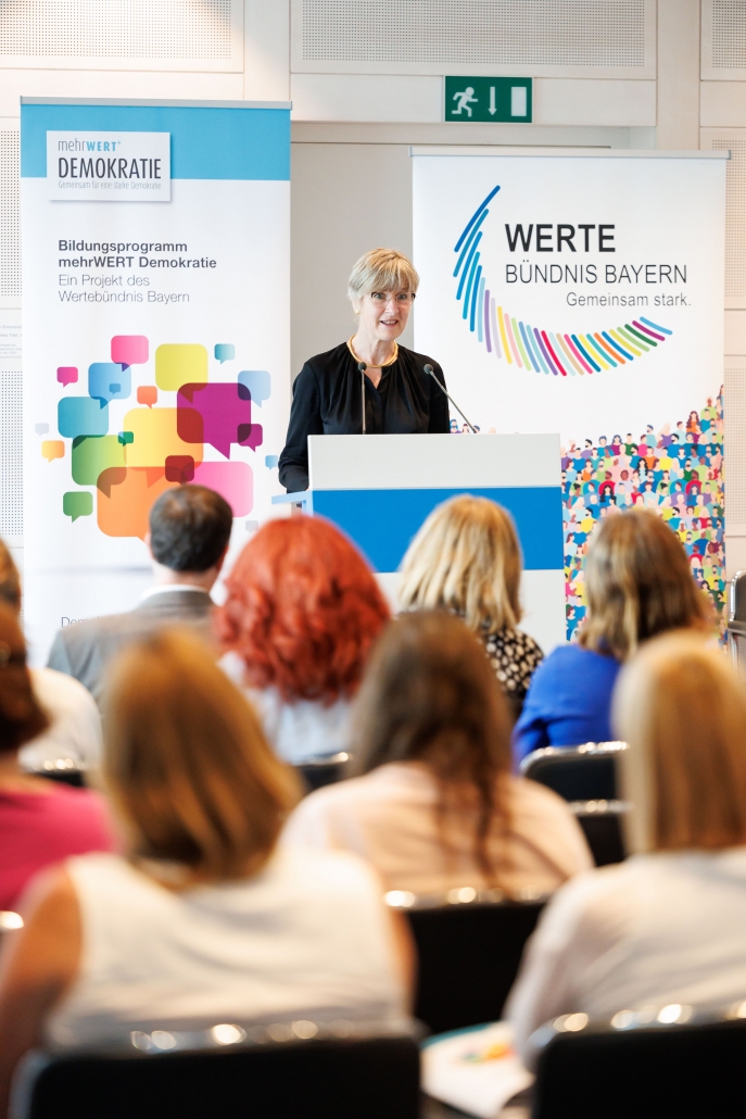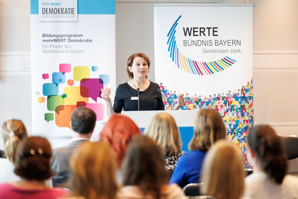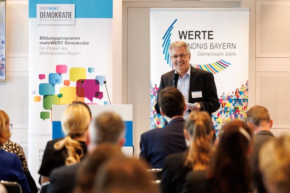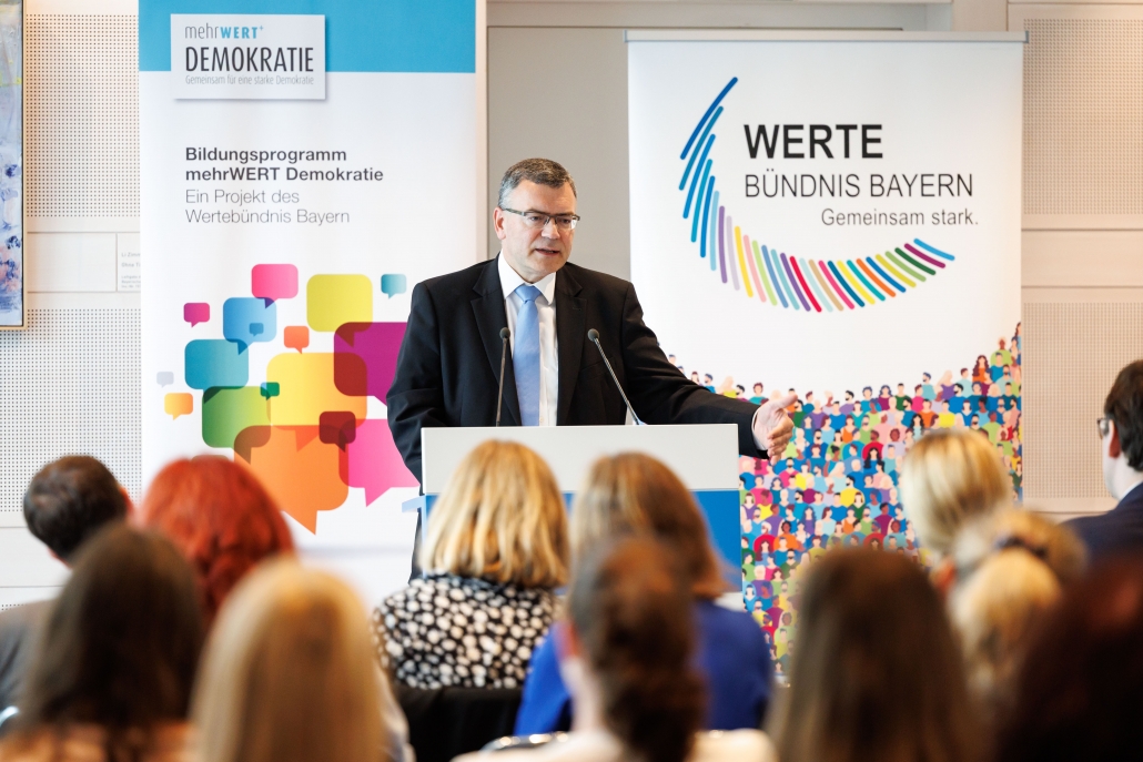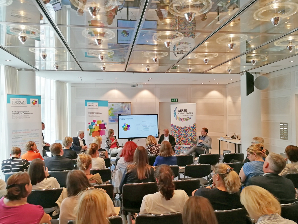 Rupert Grübl, Direktor der Bayerischen Landeszentrale für politische Bildungsarbeit ermutigte in diesem Zusammenhang die Lehrkräfte, nicht nur im Unterricht Fragen der Demokratie zu thematisieren, sondern auch die demokratische Gestaltung des Schullebens in den Blick zu nehmen. Wie wichtig es ist, den Austausch zwischen jungen Menschen und Politikerinnen und Politikern zu fördern, betonten in einer Podiumsdiskussion die Mitglieder des Bayerischen Landtags Matthias Fischbach (FDP), Thomas Gehring (Bündnis 90/Die Grünen) und Robert Riedl (FW).