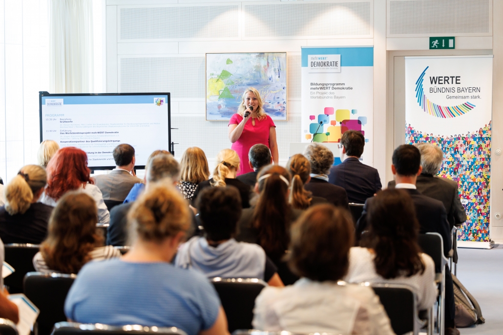 Am 24. Juni 2022 hieß der Leiter der Bayerischen Staatskanzlei und Staatsminister für Bundesangelegenheiten und Medien Dr. Florian Herrmann, MdL rund 30 Grundschullehrkräfte in der Staatskanzlei willkommen, die zur Auftaktveranstaltung des dreiteiligen mehrWERT Demokratie Qualifizierungslehrgangs „Demokratielernen und Partizipation in der Grundschule“ nach München gekommen waren. Nach Vorstellung und Begrüßung der am Projekt beteiligten Partnerinnen und Partner waren sich alle einig: Bereits im Grundschulalter sind Kinder fähig, demokratisch zu handeln und zu entscheiden. Um diese Kompetenzen zu stärken, bedarf es qualifizierter Lehrkräfte.