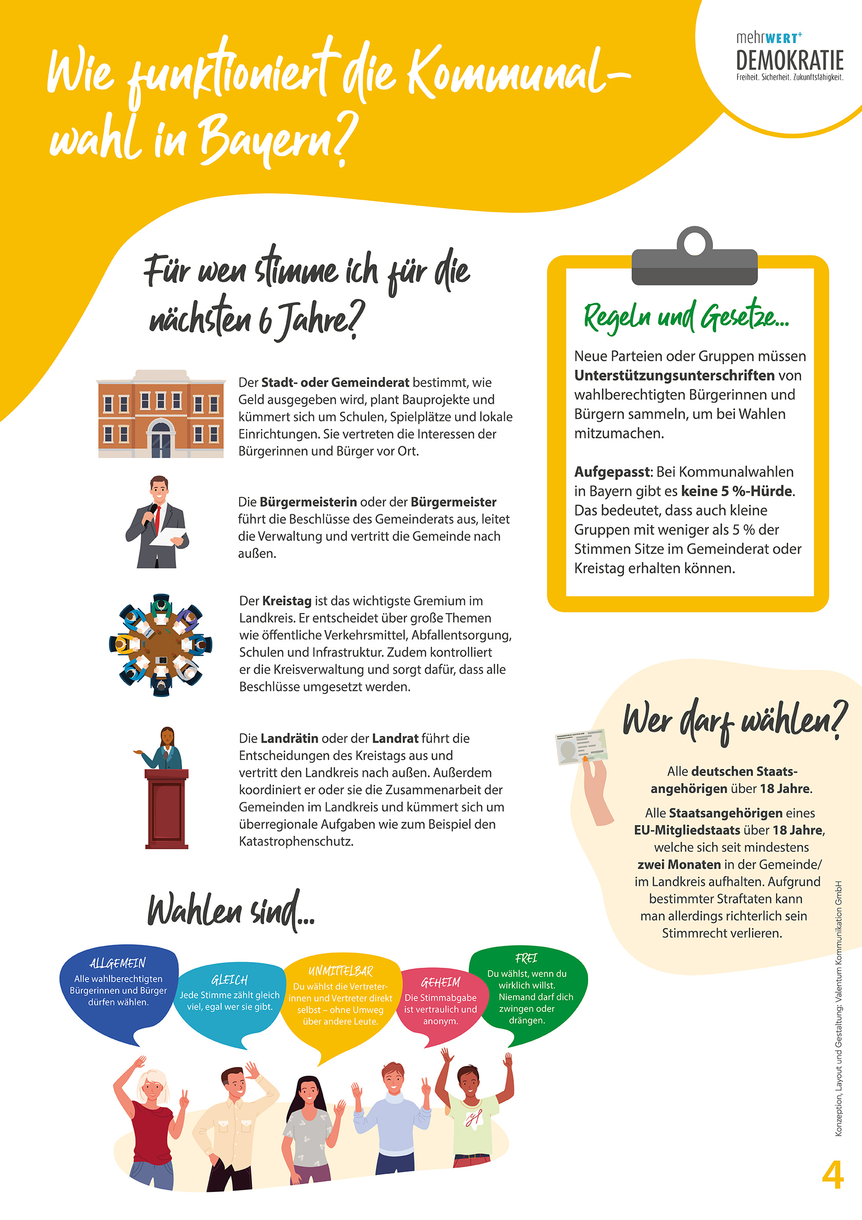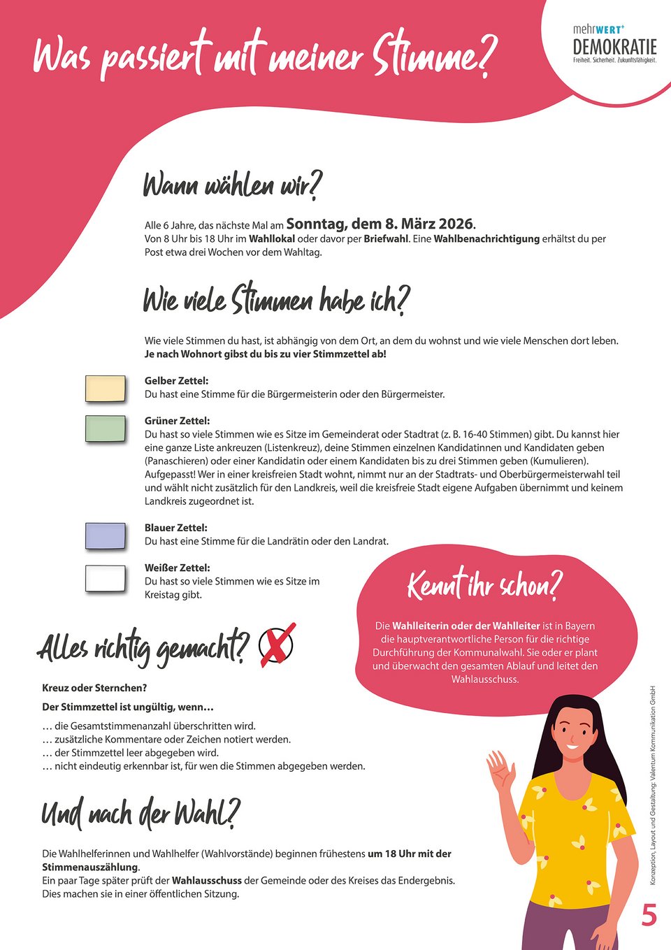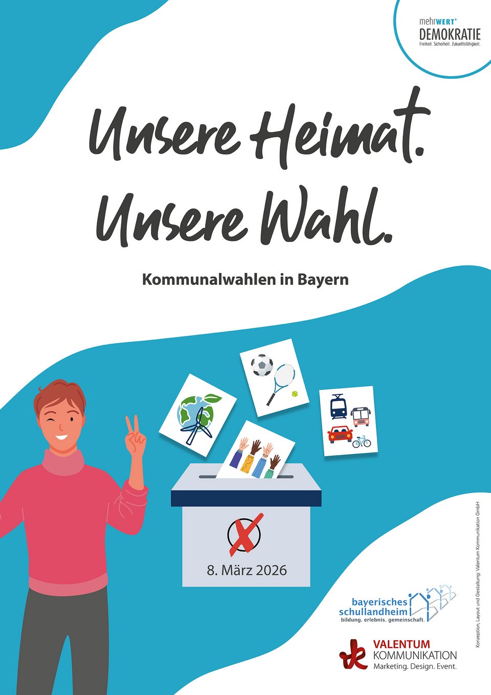 Anlässlich der Kommunalwahl 2026 haben das bayernweite Bildungsprogramm mehrWERT Demokratie (Träger: Bayerisches Schullandheimwerk e.V.) und Valentum Politische Bildung gGmbH eine informative Plakatausstellung vor allem für Erstwählerinnen und Erstwähler, aber auch für Jugendliche allgemein konzipiert, die gerne im Unterricht, im Rahmen der außerschulischen Jugendarbeit oder in öffentlichen Räumen genutzt werden können.