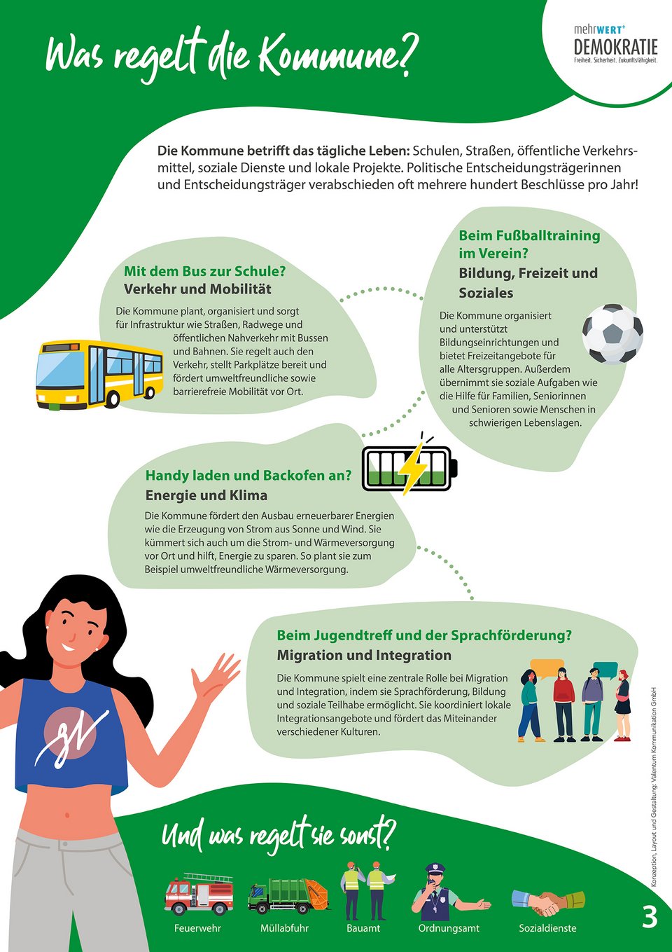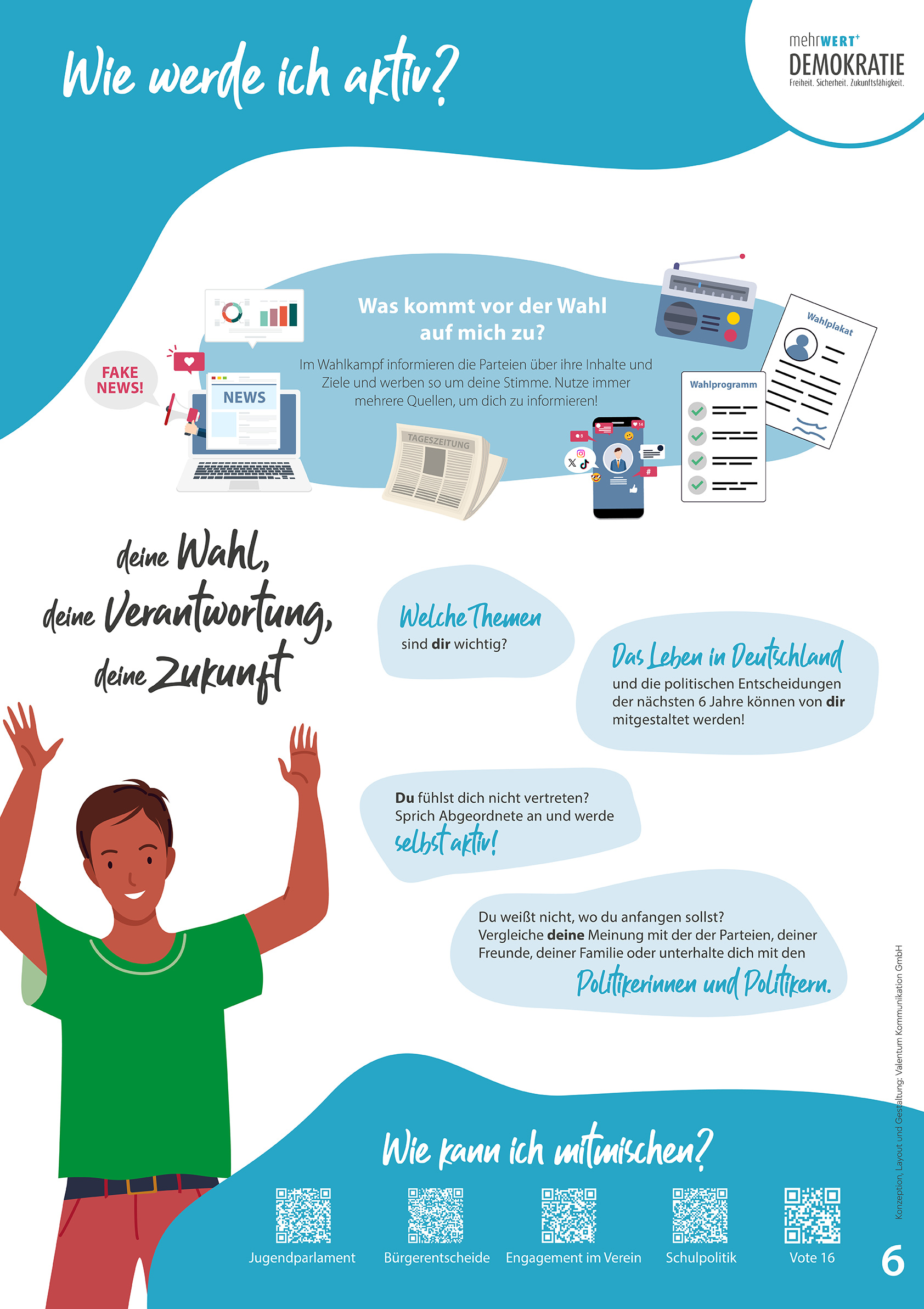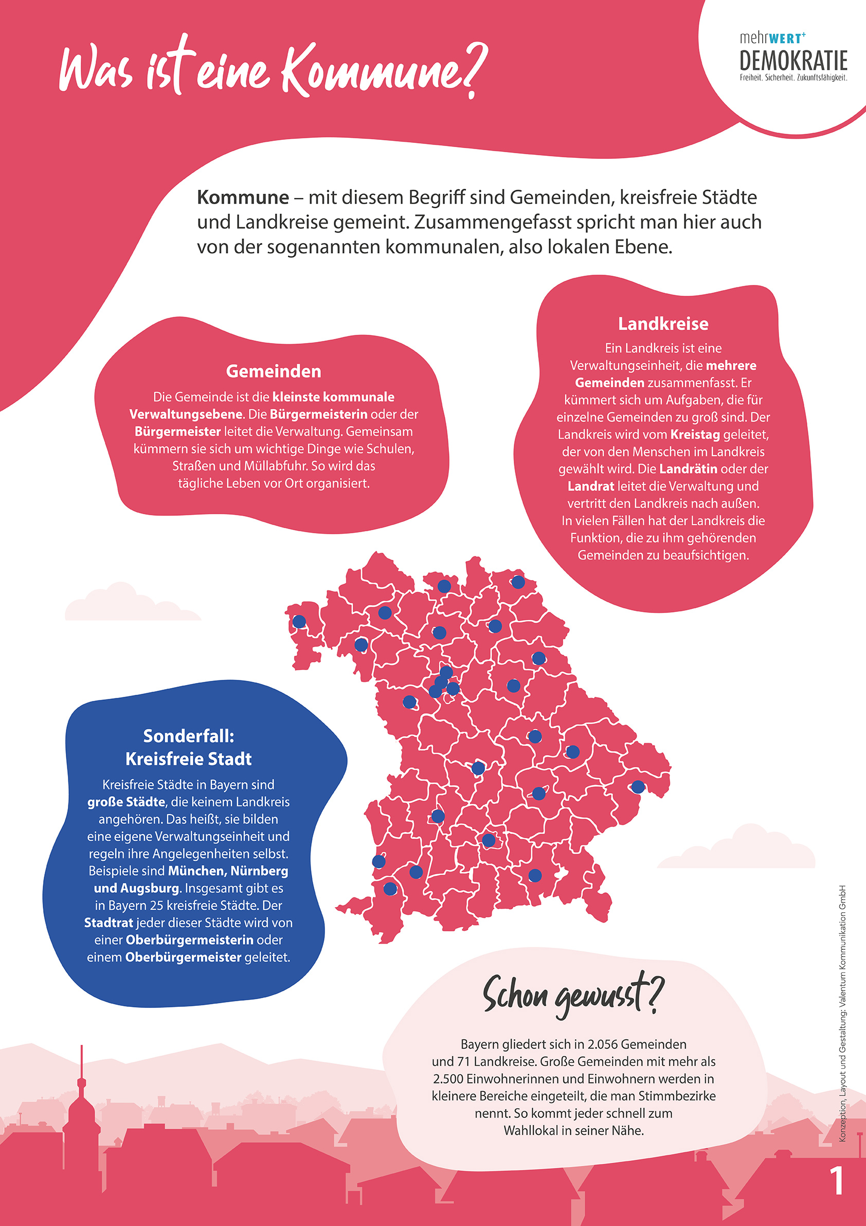 Anlässlich der Kommunalwahl 2026 haben das bayernweite Bildungsprogramm mehrWERT Demokratie (Träger: Bayerisches Schullandheimwerk e.V.) und Valentum Politische Bildung gGmbH eine informative Plakatausstellung vor allem für Erstwählerinnen und Erstwähler, aber auch für Jugendliche allgemein konzipiert, die gerne im Unterricht, im Rahmen der außerschulischen Jugendarbeit oder in öffentlichen Räumen genutzt werden können.